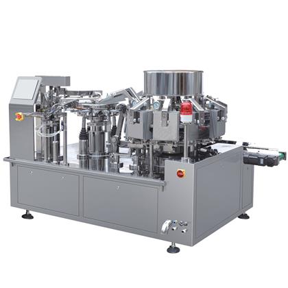 2.旋轉全自動給袋式真空包裝機由兩種分離的旋轉式機體組成(分別為充填系統和真空系統).充填系統為間歇式旋轉運轉,真空系統為連續式旋轉運動。